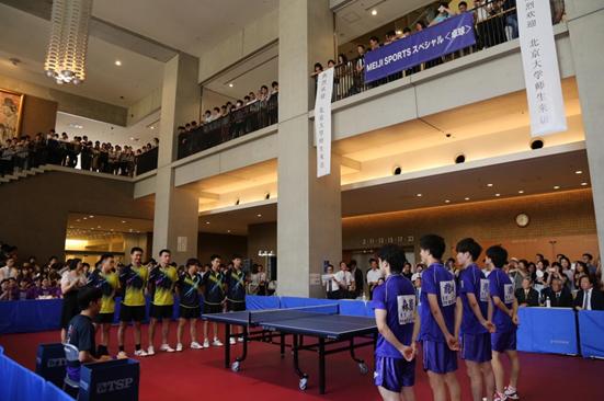 本次交流活动旨在促进两校间友好往来和乒乓球的交流发展。第三天为正式的交流活动,在明治大学教学大楼的大厅举办。明治大学非常重视这次正式的交流活动,派出了最强的几名学生,包括森园政崇(2017年世乒赛男双亚军)、酒井(曾战胜过萨姆索诺夫)、龙崎(U21级别冠军)、渡边(曾参加过中国公开赛)。但是我校乒乓球队学生不畏强敌,在三场单打和一场双打的比赛中,最终战成2:2,充分展现出中国大学生顽强拼搏的精神。