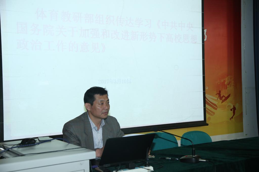 “育才造士,为国之本”。当前,我国正处于全面建成小康社会的决胜阶段,比历史上任何时期都更加接近中华民族伟大复兴的目标。青年学生是国家和民族的未来,重视学生教育就是重视未来。李主任指出,在时代的紧要关头,必须重视思想政治工作在学院的重要地位,必须在马克思主义的指引下,开展教学工作,只有这样,才能培育“有理想、有道德、有文化、有纪律”的社会主义接班人。从体教部的实际情况出发,李主任指出,加强和创新学院的思想政治工作,主要从教师和学生这两个层面入手,强化师资队伍建设和学生思想政治教育。教师是人类灵魂的工程师,承担着神圣的使命,教师必须做到以身作则,不论是教室里的文化课,还是操场上的体育课,教师不光承担着教学任务的传授,还必须站在一个更高的立足点上,培养学生的责任意识、家国情怀和意志品质。最近,国家多次强调传承中华民族优秀传统文化的重要性,加强和创新学生的思想政治教育,可以着眼于文化视角,以文化育人,中华民族优秀传统文化同民族精神、社会主义核心价值观紧密相连,将文化穿插于教学过程中,改变传统、枯燥的思想政治教育方式,是当前教学工作的重要任务。
