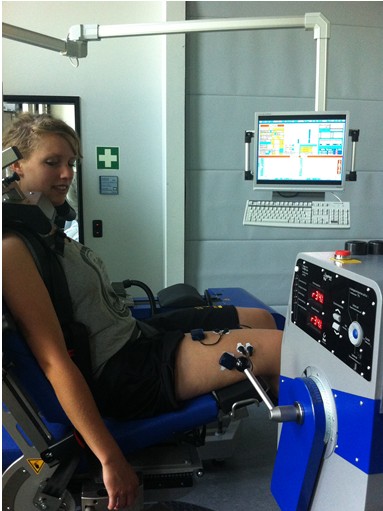 学生在膝关节康复训练中观察股直肌和外侧头的肌电活动 |
