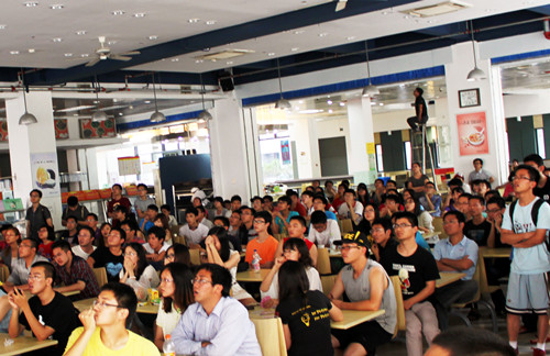 此次比赛激发了北大篮球爱好者的热情,为了方便同学们观赛,在体教部的积极联络下,农园食堂打开了一层的电视,通过大屏幕对比赛进行直播。随着赛事的进行,越来越多的同学涌入食堂,观看这场精彩的决战。在全场比赛结束后,现场的掌声也经久不息,北大的同学们用这种方式,表达了母校对男篮小伙子们的支持。