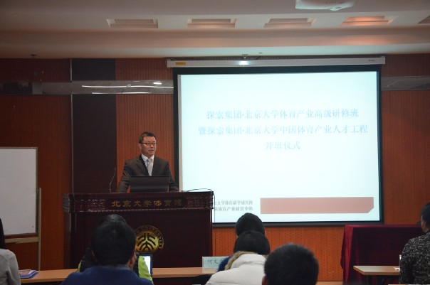 开课仪式由北京大学中国体育产业研究中心执行主任何文义先生主持。北京大学体教部书记张锐教授,探索集团执行总裁肖志华先生分别致辞。研修班暨人才工程学制一年,采取每月集中授课的形式,本次集中授课为期三天,自22日至24日。