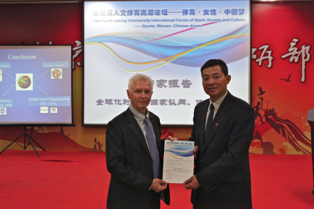 简短的开幕式后,远道而来的国际体育社会学学会主席,来自英国的Elizabeth Pike教授为在场嘉宾做专题报告:“从伦敦奥运会看全球女子体育的发展”,随后,来自新西兰的副主席Steve Jackson教授就“全球化时代的国家认同、体育和文化”做专题演讲。专题报告分别由北京大学体育部主任李宁,北京大学体育科研所所长郝光安教授主持,报告结束后,主持人为两位教授颁发荣誉证书。