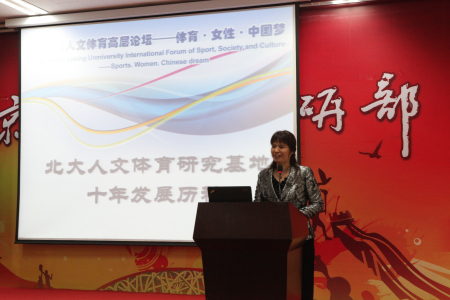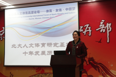 此次第四届人文体育高层论坛的另一大主题是庆祝“北大人文体育研究基地”成为国家体育总局体育社会科学重点研究基地成立十周年,北大人文体育研究基地副主任董进霞教授向在场嘉宾做了基地成立10周年来的发展历程汇报。