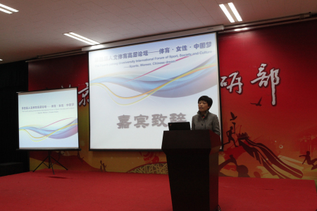 国家体育总局体育科研所副所长祝莉女士随后致辞。她首先向在座的嘉宾介绍了中国体育科学学会及体育社会学学会的性质和作用。谈及社会性别与体育研究,祝所长认为,北京大学体育部于2002年成立的妇女体育研究中心,十多年来借助北京大学多学科的人才优势,与国内外的妇女研究中心、体育研究机构以及专家学者同仁携手合作,共同探索妇女体育的相关问题,促进体育领域的男女平等,鼓励和推动妇女全面参与体育训练与管理决策的过程,在妇女体育发展进程中发挥了积极的作用。