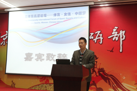 国家体育总局政法司政策法规处卫虹霞女士受国家体育总局政策法规司的委托,向论坛的开幕表示热烈祝贺。她表示,体育事业科学发展的进程中要高度关注女性需求,在社会管理中积极回应女性关切,为女性发展创造良好的环境和公平条件,希望北大人文体育研究基地继续深入开展体育科学研究,推动体育强国建设,共建和谐社会,在实现“中国梦”的征程道路上,让中国女性绽放出更加夺目的光彩。