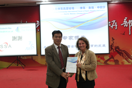 郝光安教授为国际体育社会学学会主席Elizabeth Pike颁发证书
