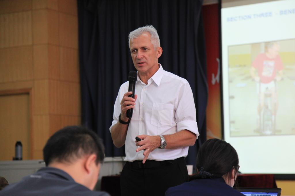 Wojtek教授的讲座主题为“体力活动与健康老龄化”。讲座伊始,教授以严谨的学术态度介绍了美国运动医学会对运动(exercise)和身体活动(physical activity)的研究定义及对理论、观点准确性的级别定义,进而从普通人群的老龄化、运动和体力活动对老龄化的抑制作用以及运动和体力活动的有利影响等三个方面展开具体的论述。他指出,未来老年人健康的学术研究趋势主要在于老年人运动中的风险评估及其有效规避、运动与生活品质之间的关系、休闲时间中的体育运动开展等方面。