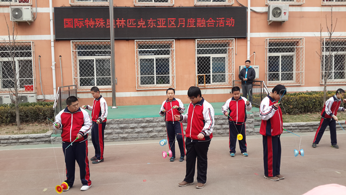 活动伊始,所有嘉宾的目光都被培智学校同学们的空竹表演吸引了,据指导老师介绍,同学们为完成合格的空竹动作,经常抽出课余时间进行练习,孩子们喜欢玩空竹,既锻炼了手脑协调能力,又拉近了小朋友的距离。