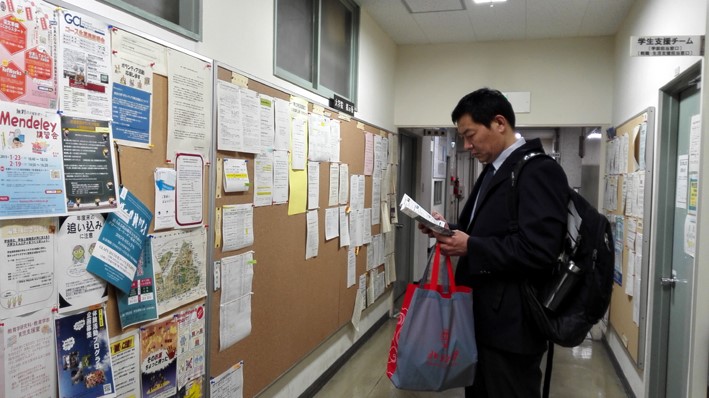李宁主任正查阅东大体育与健康教育教研室公告栏