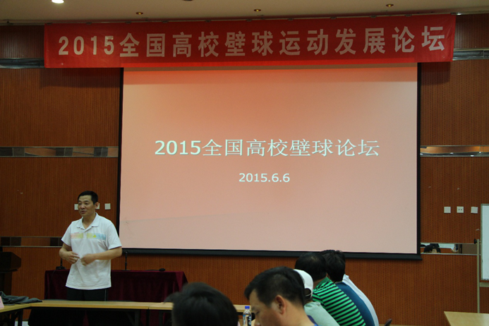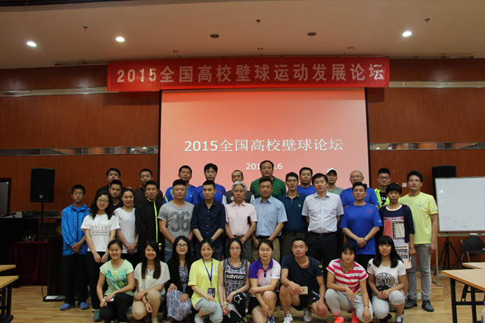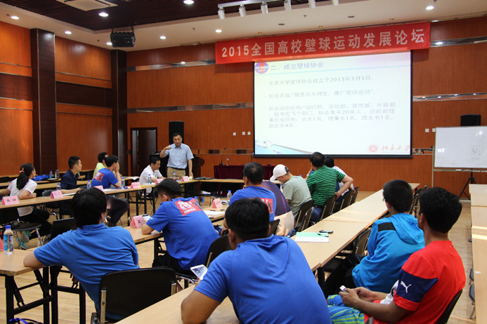 6月5日,来自北京大学、浙江大学、合肥学院、宁波诺丁汉大学、重庆工商大学、南京体育学院、吉林体育学院、中央党校这八所开展壁球运动较早的高校共聚燕园,在邱德拔壁球厅进行了为期三天的壁球比赛和交流。6日晚,由北京大学壁球协会主办的“2015全国高校壁球运动发展论坛”在邱德拔报告厅召开,北京大学体育部主任李宁、副主任吴昊以及参赛的高校代表出席,论坛由北京大学教授何仲恺主持。本次论坛的主要任务是:探讨如何在高校开展壁球运动,壁球运动如何更好的服务于高校育人目标。北京大学和其他兄弟院校协力承担起推广壁球运动的使命。
