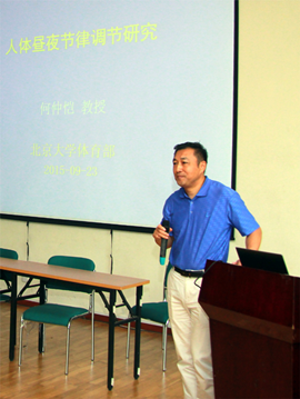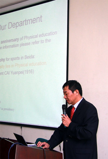 北大体育部张锐教授(左)向客人介绍北大的体育科学研究