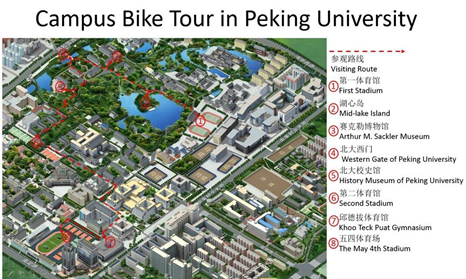 9月22日下午的校园骑行参访体育场馆和实验室活动中,陪同骑行的人员包括体育部卢福泉博士、早稻田大学驻北京教育处主任杨振博士和包红英老师,以及北大车协和体育部的研究生一行11人。参观的路线从第一体育馆出发,途径未名湖,参观第二体育馆、邱德拔奥运馆以及五四体育中心(图1)。可惜天公不作美,骑行不久就开始下雨,以致参访途中在人文学苑和未名湖均斋两度躲雨,但同时也给双方增加了交流的机会。日本教授对我校的体育设施和场馆印象深刻,赞赏有加。