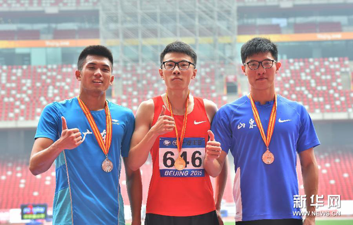 冠军郭钟泽(中)、亚军毛国荣(左)和季军翟超在2015全国田径冠军赛暨大奖赛总决赛男子400米决赛中(新华社记者李文摄)