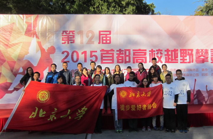 在北京大学体育教研部群体办公室钱俊伟、袁睿超、张亚谦等老师的精心策划下,北京大学近30名学生在领队李德昌老师的带领下,参加了于2015年10月31日上午9:00在北京林业大学鹫峰基地举办的第12届首都高校越野攀登赛。比赛分为甲乙丙三个组别,共计30所高校参加比赛。北京大学越野攀登队由10名参赛队员和15名拉拉队队员组成,他们用约一个半小时的时间完成约7公里的往返路程。