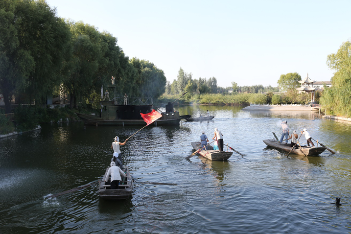 馆外,水上练兵还原了当年雁翎队及当地军民与日本侵略者艰苦卓绝的斗争场景,大家深切体会到当今和平来之不易。