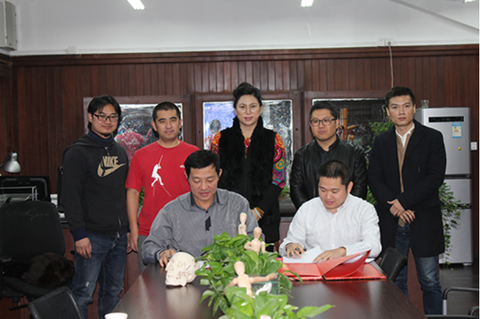 签约仪式:前排李宁博士,、刘昊扬博士,后排左起:卢福泉博士、陈江博士、张锐教授、王志兵经理、陈楸帆副总裁