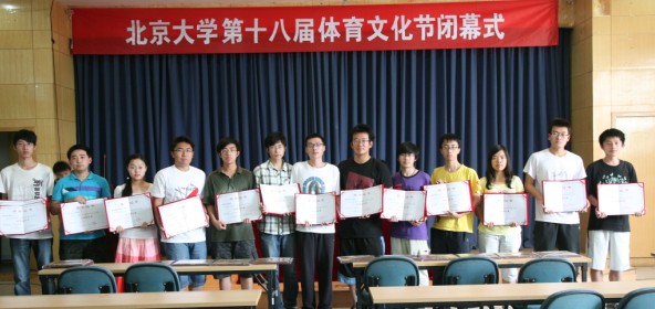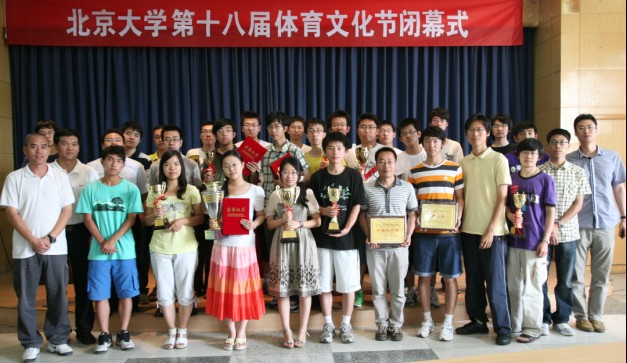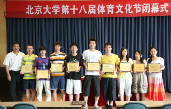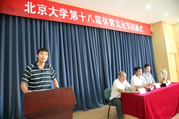 6月10下午,2011年北京大学第十八届体育文化节闭幕式在五四体育中心多功能厅举行。来自各个院系的领导和学生代表会聚一堂,总结本届文化节的突出成果,并提出下一届的基本方案。