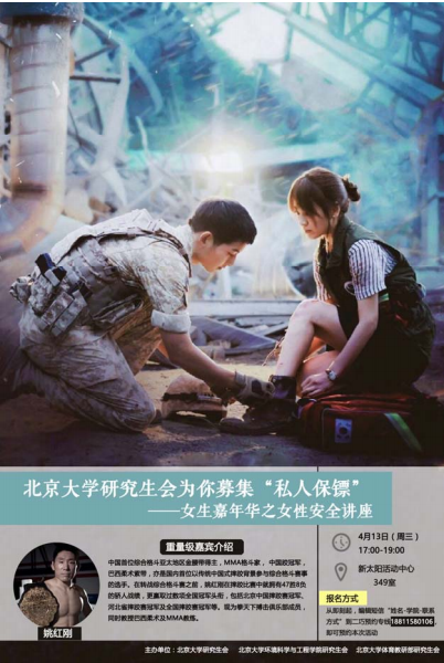2016 年 4 月 13 日,由体育教研部研究生会、环境科学与工程学院研究生会与 北京大学研究生会共同举办的——“女性嘉年华之女性安全讲座”,在新太阳活 动中心完满结束。参加者还有现场工作人员都表示所获甚丰,如果加以练习, 日后若遇到不同类型的近身攻击,这次所学一定可以大派用场.