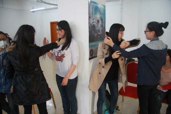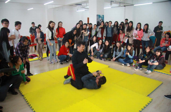 姚教练与其搭档首先为我们示范了如何争脱抓手、靠壁等站式袭击,随后进一 步和大家探讨如何应对被压制在地面时、以及被从身后侵袭的情形。不同身位 有各异的反制动作,但是相互之间又有共通之处——比如反击要实时和迅速, 让施袭者的奸计迅速破灭;站姿反制要降低重心;地面反制需要胳膊和腿部配 合来钳制对方。