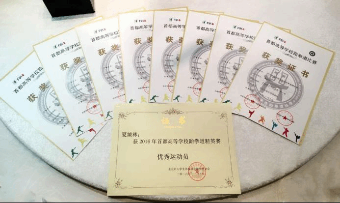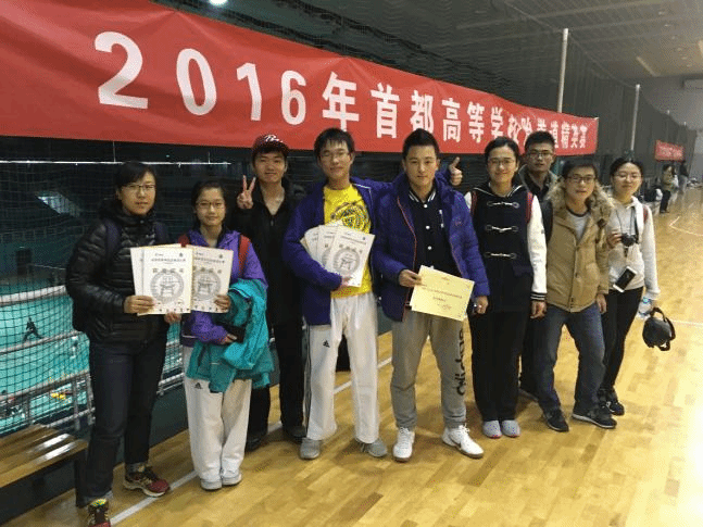 11月 5日,2016年首都高等学校跆拳道精英赛在北京科技大学体育馆拉开战幕。在本年度的高校跆拳道锦标赛中获得各项目以及团体前八名的运动员和高校有资格报名参加本次赛事,本次赛事共有来自13所高校的161名运动员参赛。年轻的北京大学跆拳道代表队共派出4名运动员征战本次比赛,夏虓林获得品势男子个人冠军和男子竞技68kg级亚军,夏虓林、杨旭获得品势混双组亚军,杨旭、丁梦坤、赵园红获得品势女子团体组第五名,杨旭获得品势女子个人第八名的佳绩。刘林青老师获得2016年首都高等学校跆拳道精英赛“优秀教练员”荣誉称号,夏虓林同学获得“优秀运动员”称号。