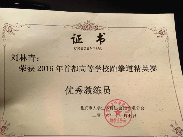 刘林青老师获得2016年首都高等学校跆拳道精英赛“优秀教练员”