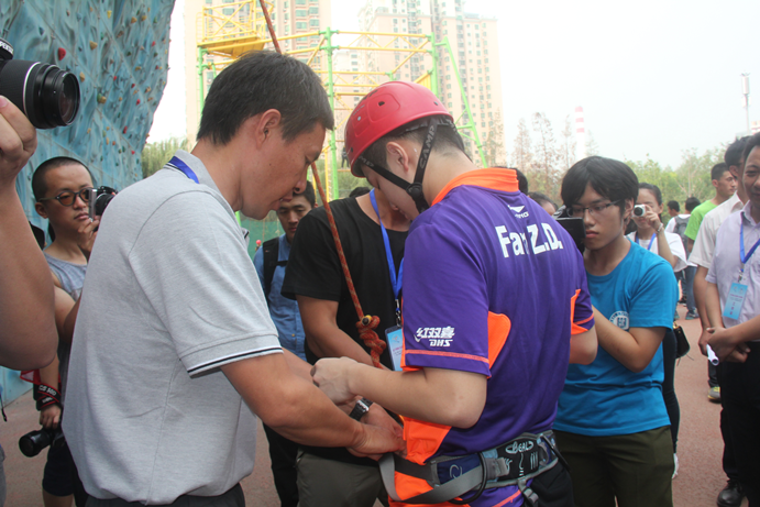 钱永健老师为世青赛乒乓球冠军检查攀岩装备