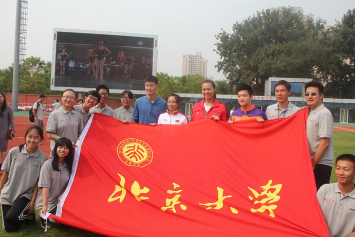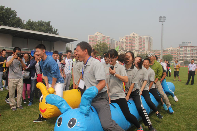 各代表队健儿和观摩团队在启动仪式上进行同心鼓、毛毛虫、旋风跑、能量传输等喜闻乐见的拓展项目体验。北京大学拓展运动代表队由北京大学素质拓展协会的学生们组成,他们在毛毛虫项目中的表现得到全场同学们的赞赏,并吸引了大量同学前来小试身手。此次活动的形象大使们在张培萌的带领下,组成一支队伍和北大钱永健老师带领的队伍进行“毛毛虫骑行”比赛,大家整齐的口号与奋进的步伐,充分的展现了拓展作为“阳光体育”运动的魅力。
