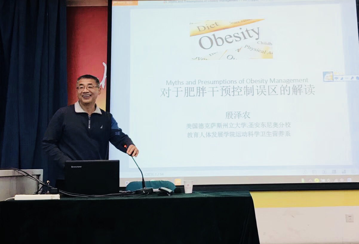 12月8日下午,由北京大学体育教研部主办的北大体育学术系列讲座在五四体育中心205室成功举行。来自美国德克萨斯州大学圣安东尼奥分校的殷泽农博士围绕“肥胖干预控制误区的解读”这一主题进行报告。本次讲座由体育教研部书记张锐教授、董进霞教授主持,来自体教部的老师和研究生、其他院系的老师、研究生以及本科生参加了本次讲座。