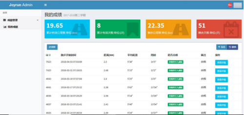3、 登录考勤管理系统后,可在成绩管理直观看到自己的累计跑步里程、有效次数、剩余里程、剩余时间。