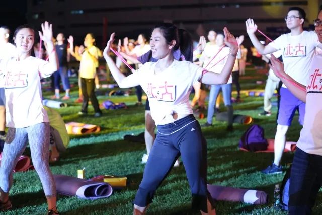 两个星光璀璨的夜晚,包括明星健身课程和荧光夜跑两个环节,狂炸的电音搭配着炫酷的灯光舞台,在专业的健身导师的带领下,北大人亲身体验运动带来的乐趣。