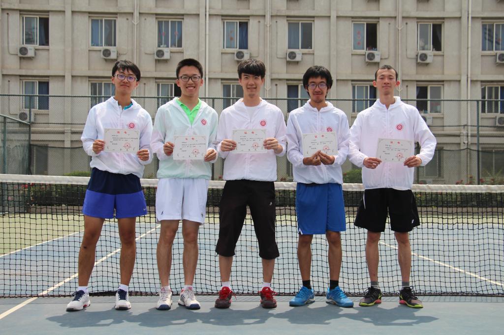 5月19日的半决赛如期开赛,吴昊老师早早来到现场指导,整个队伍相互支持、相互鼓舞充斥了整个男队比赛的赛场。在大家的加油、呐喊中,队长朱江成、副队长王正迅速以6:1、6:2两个单打直落半决赛对手清华大学一队,杀进决赛。决赛对手为清华大学二队,但在整个队伍强大的凝聚力和已如熊熊烈火般的士气面前,任何困难都已无法阻挡男队前进的步伐,朱江成、王正再次以两个强势单打横扫清华大学二队,将冠军收入囊中。