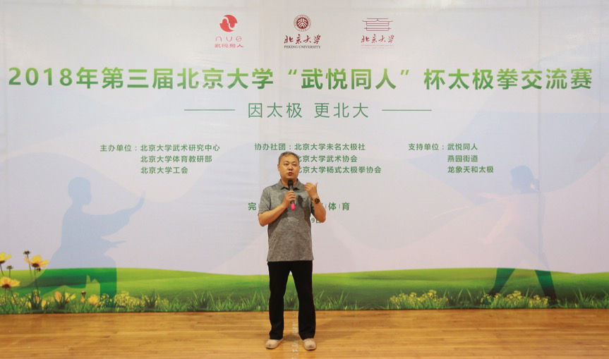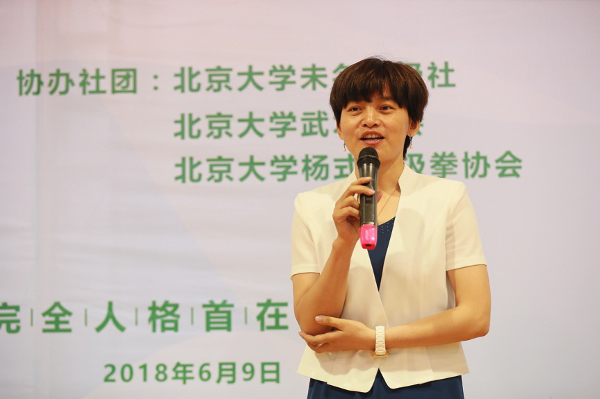 “刘杉杉博士提到,未名太极社成立于2018年3月2日,短短3个多月的时间就吸纳了300余名教职工会员,会员们积极参加每周两次的太极拳练习和未名太极社组织的运动康复指导、健康讲座等丰富的社团活动,其科学运动的意识和能力得以增强。活动取到良好实效,这次100多名教师参加本次比赛就是最好的证明。他希望未名太极社继续发挥社团作用,更好地为北大教师健康服务。”