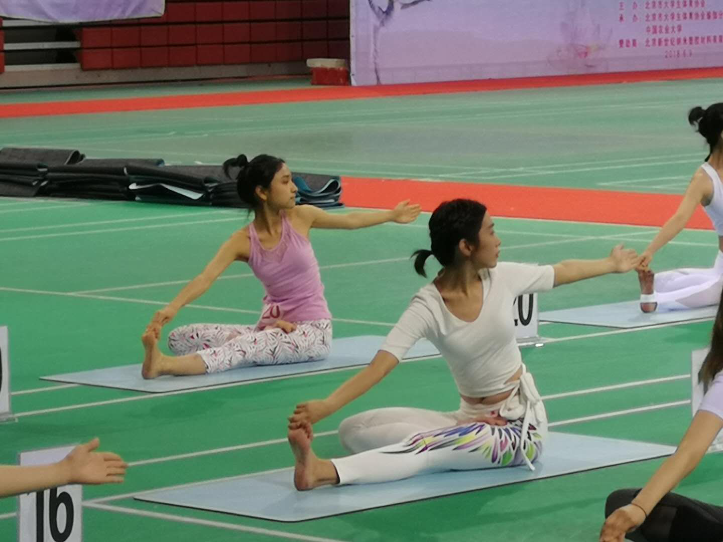 第三个参赛项目,女子团体项目。八名同学(王雨童、权璟、韩露、王硕、任思奇、张玲玉、李若白、钟孔鹭)齐心协力,共同贡献了美轮美奂的团体动作《春之舞》,再创二等奖佳绩。八名同学分属不同院系和年级:王雨童、任思奇是中国语言文学系16级博士生,张玲玉是经济学院16级博士生,王硕是物理学院14级博士生,韩露是地球与空间科学学院14级本科生,李若白是中国语言文学系14本科生,权璟与未上场队员申子靖是城市与环境学院14级本科生,年级最小的钟孔鹭是哲学系15级本科生,充分体现了瑜伽运动在北大的广泛性。其中还有四人刚接触瑜伽不长时间。队员们发挥团队精神,克服了训练时间紧、基础差、动作要求高等困难,最终在比赛中用勤奋换来了稳定,用信念换来了成功。