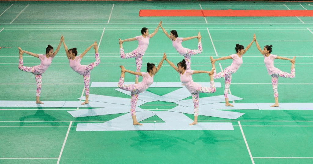 代表队8名队员在团体艺术比赛中的动作展示