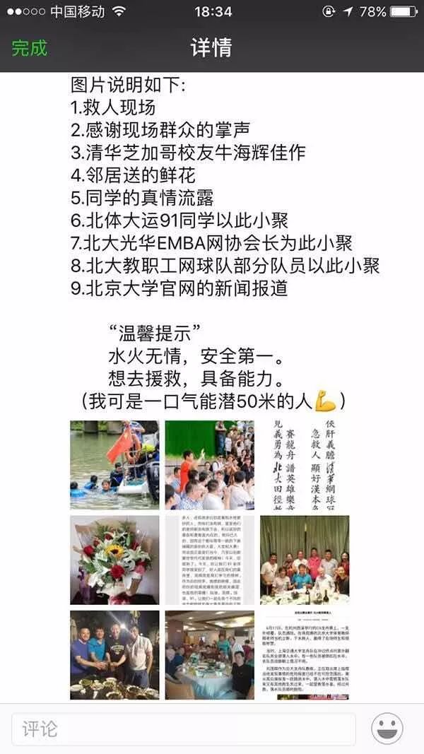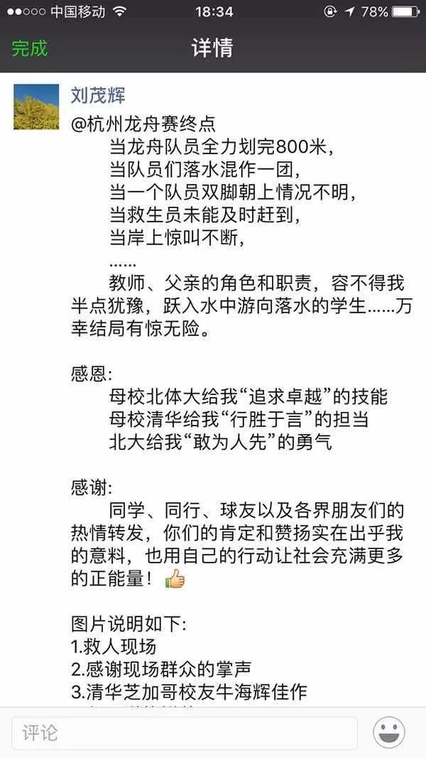 平时不怎么发朋友圈的刘茂辉一周后才知道这事被很多人关注了。他表示,社会上独善其身的人很多,但是敢于担当、敢于担责还是挺重要,“我们的师德尊严、学风建设也是一直以正能量的传播为目标。不过大家也不要认为会游泳就能够救人,这完全是两个概念,不要逞能,否则也会适得其反。如果自己不会游泳,可以及时利用身边的竹竿、救生圈、绳子等往水里抛,最主要还是大声呼救。”