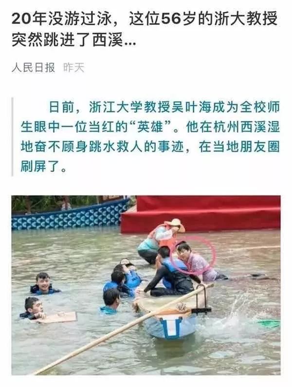 6月17日,在杭州西溪举行的C9龙舟赛上,发生惊险的一幕,一支龙舟意外倾覆,队员遇险。在场观赛的北京大学体育教研部刘茂辉老师当机立断,下水救人,随后,在主席台观赛的浙江大学吴叶海教授也跃入水中,赢得了在场师生和观众的一致称赞。