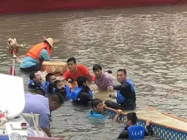 当时,上海交通大学龙舟队队员全力冲刺完800米,终点线上原本并驱的两艘参赛龙舟中的一艘突然翻船,船上11名学生和一名当地工作人员(舵手)均落水,当时还有学生被压在船下无法脱身。