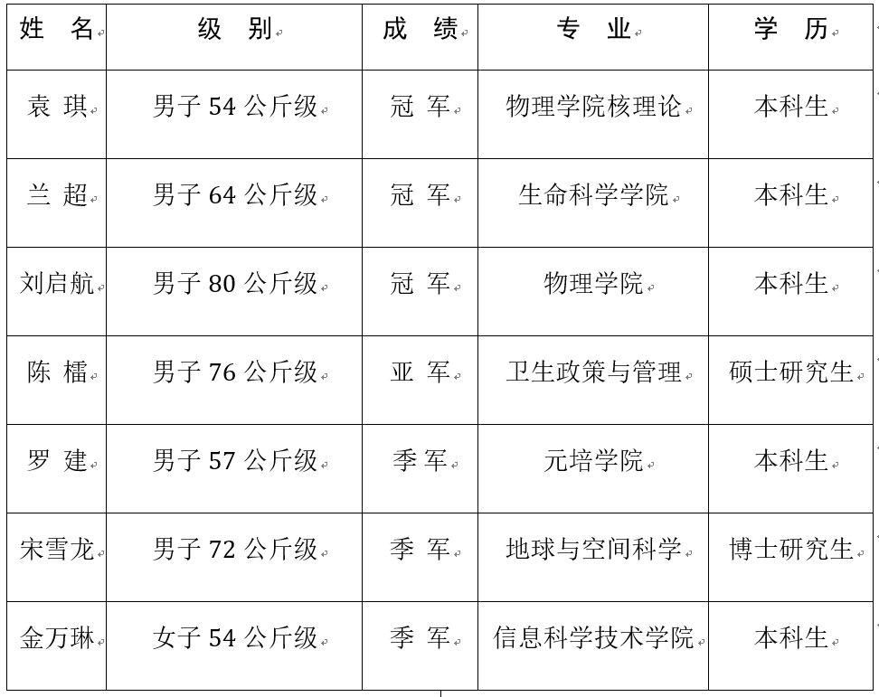 本次比赛,北京大学散打队共派出7人参加比赛。在毛智和老师和刘林青老师的带领与指导下,北大散打队员克服重重困难,最终七人斩获三金一银三铜的优秀成绩。充分体现北京大学对学生培养注重全面发展、成长成才的教育理念。