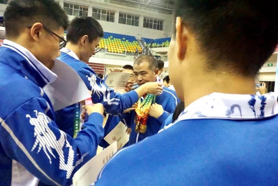 颁奖仪式上队员兴奋地为教练员戴奖牌
