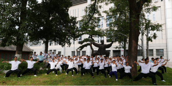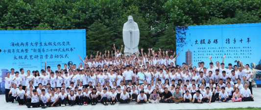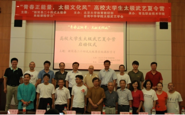 2015年7月11日-7月24日,北京大学体育教研部、中华学院太极武艺学会与青岛职业技术学院,在青职学院共同主办海峡两岸大学生太极文化交流十周年庆典暨“新简易二十四式太极拳”系统课程研习营活动。来自两岸二十余所高校的200余名师生及嘉宾齐聚青岛,通过系统的研讨与习练,进一步完善了“新简易二十四式太极拳”教案内容与教学方式,并为共同打造致力于以太极武艺为载体,深入推动两岸高校文化交流的特色平台献力。图为北京大学体教部副主任吴昊博士前往参与成果汇报仪式后与在场师生合影留念。