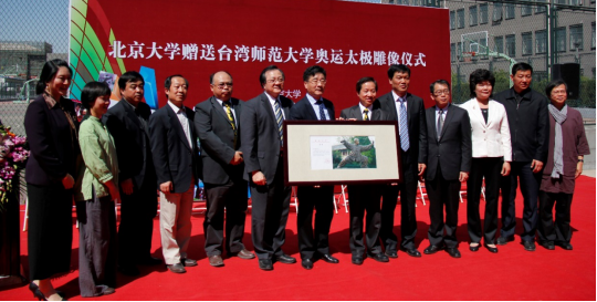 2013年4月30日北京大学赠送台湾师范大学奥运太极雕像赠送仪式上,北京大学时任副校长刘伟教授,北京大学体教部书记张锐教授(左一)、李宁主任(时任副主任,右二)、前主任郝光安教授(右五)、李杰副主任(左三),新闻与传播学院时任书记冯支越书记(左四)、台湾师范大学时任校长张国恩教授(右六)等嘉宾合影留念。