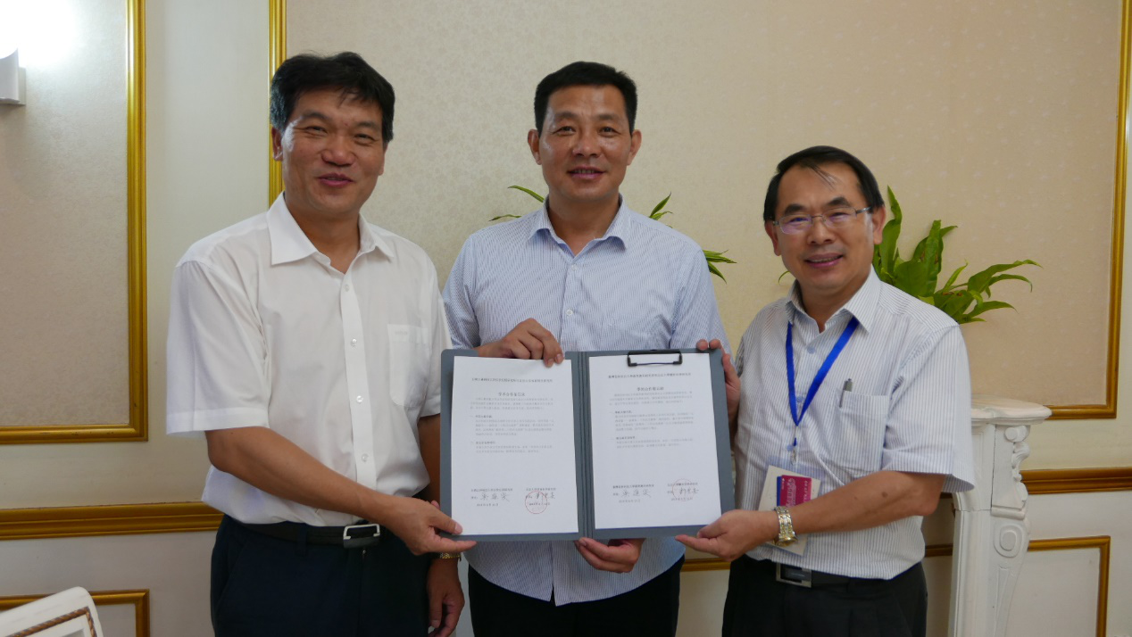 郝光安教授(左)与吴进安教授(右)签署合作协议后,与北京大学体育教研部李宁主任(中)合影留念