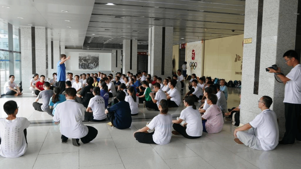 北京奥运太极雕像创始人林添进研究员为同学们讲座演习动作,同学们席地而坐,专注听讲