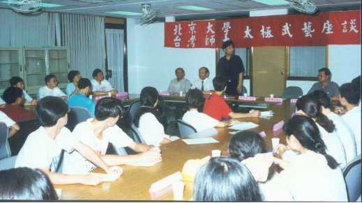 1997年,时任北京大学校团委书记王登峰教授与时任团委副书记张彦教授,率北大老师及杨式太极拳协会学子访问学院太极的发源地台湾师范大学,进行太极武艺文化交流。学院太极1994年传至北京大学,始终重视太极文化的学术研究以及在青年学子中的传习和普及。上图为访问期间举行太极武艺座谈。起身发言者为时任北大团委书记王登峰教授(现教育部体育卫生与艺术教育司司长)。