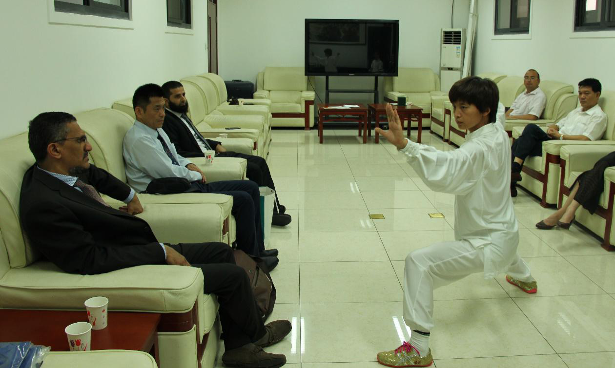 体科所办公室主任王东敏老师和学院太极讲师邹海波老师,分别应邀向贵宾展示了陈氏太极拳与学院太极的“新简易二十四式太极拳”段落,令阿卜杜勒·阿齐兹国王大学的贵宾们对于太极拳有了直观印象,赢得与会嘉宾的热烈掌声和赞美之意。王东敏老师还与嘉宾们交流太极拳的技法,与嘉宾互动,引起了嘉宾对太极拳的强烈兴趣。