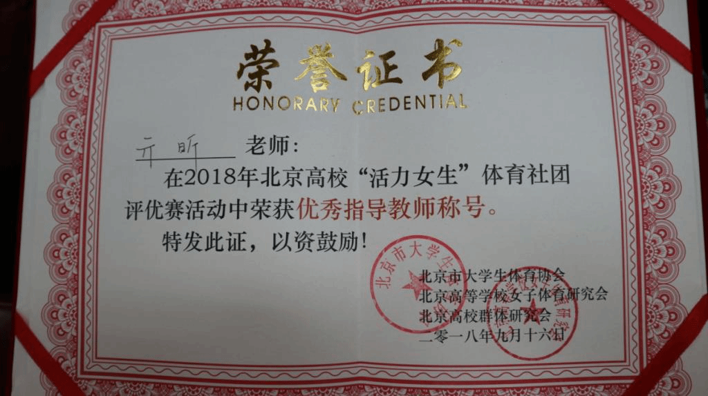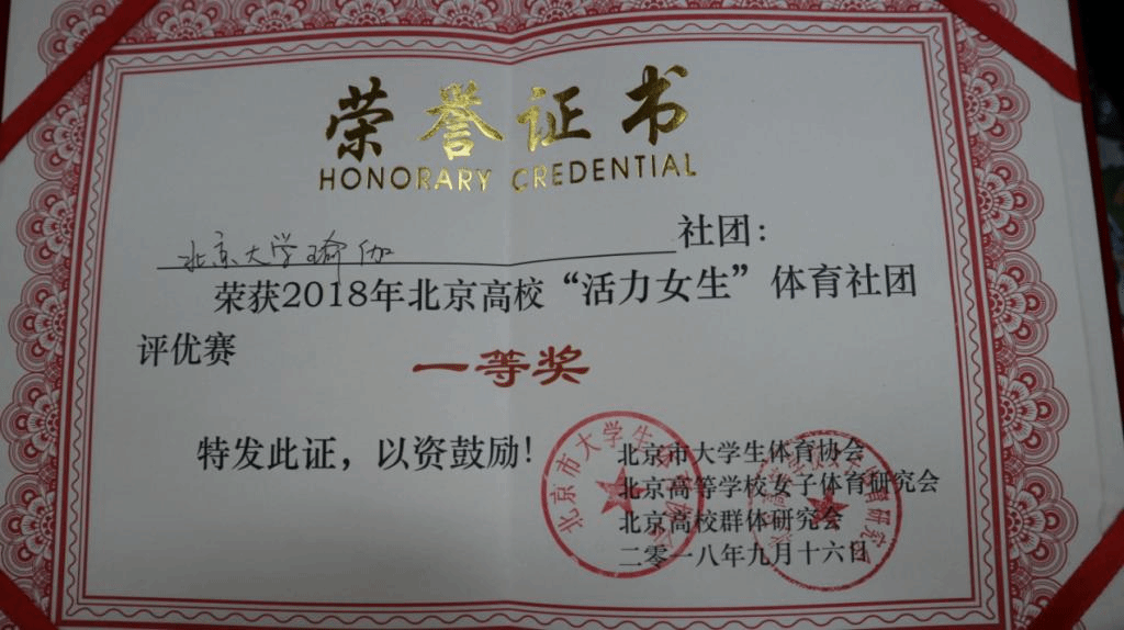 2018年9月16日下午1时许,北京大学体育教研部亓昕老师携北京大学学生瑜伽队两位骨干袁乐琼和纪若楠,共同赶赴北京信息科技大学参加2018年首都高等学校活力女生体育社团评优赛,并在到场参赛学校中脱颖而出,荣获一等奖;亓昕老师获得优秀指导教师荣誉称号。