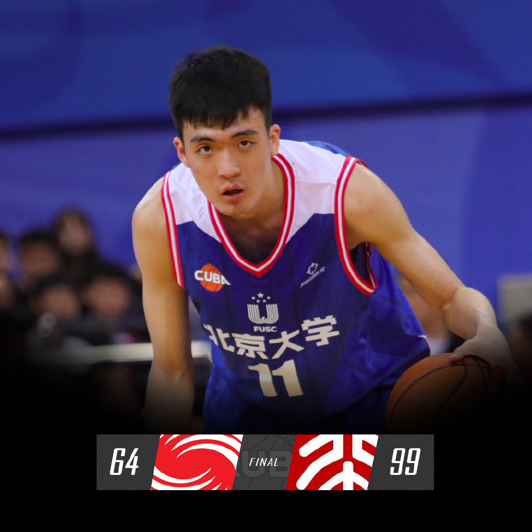 开场后北体大先发制人,刘毅、陈伟强里突外投惊出北大一身冷汗,但回过神来的北大立刻展开反击,王少杰在篮下势不可挡,刘育辰同样架起炮台连续取分,北大迅速将分差扩大,半场结束时比分来到52-31。半场休息没有影响到北大的进攻势头,下半场比赛成为刘育辰的表演舞台,他在进攻端几乎弹无虚发,帮助北大将分差扩大到30分以上,比赛失去悬念,最终北大99-64战胜北体大,轻松收获小组头名。