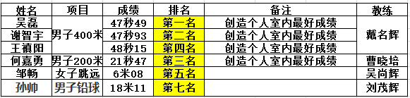 经江苏南京和陕西西安四站室内分区赛最好成绩排名,各单项前12名的运动员获得参加浙江杭州萧山基地室内总决赛资格。北大运动员吴磊、谢智宇、何嘉勇、王禛阳、邹畅、孙帅在分站赛上取得了优秀成绩,最终获得资格。此次比赛中,北大运动员取得参加室内锦标赛以来历史最好成绩。