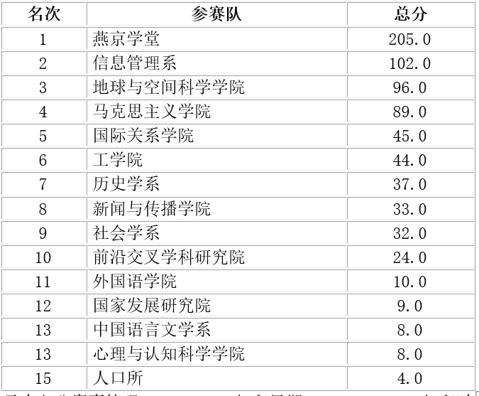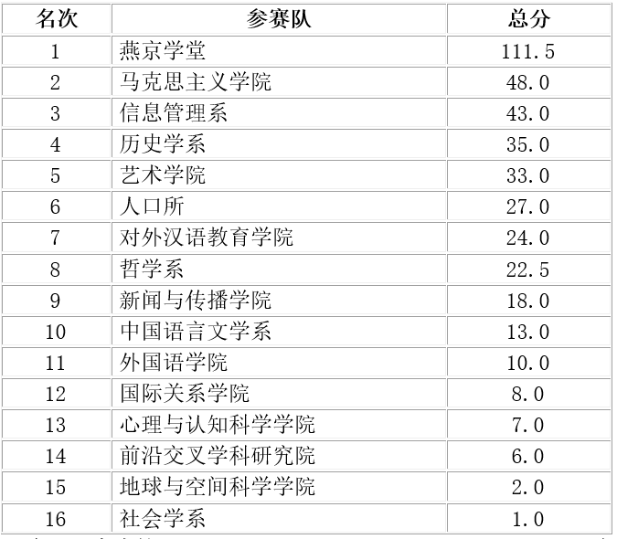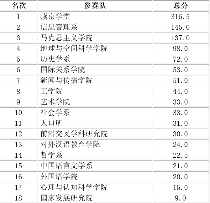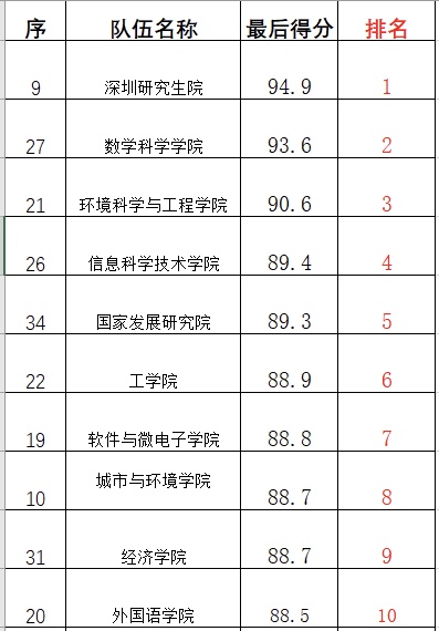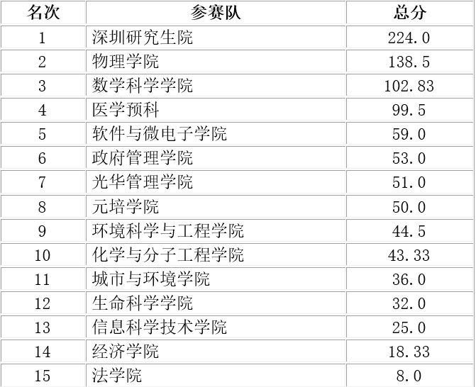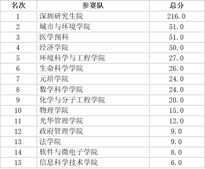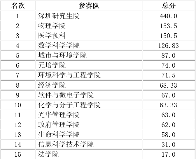 深圳研究生院包揽了男子甲组、女子甲组和男女子甲组的团体冠军,以及院系风采展演的第一名;男子乙组、女子乙组、男女子乙组的团体冠军则被燕京学堂收入囊中。