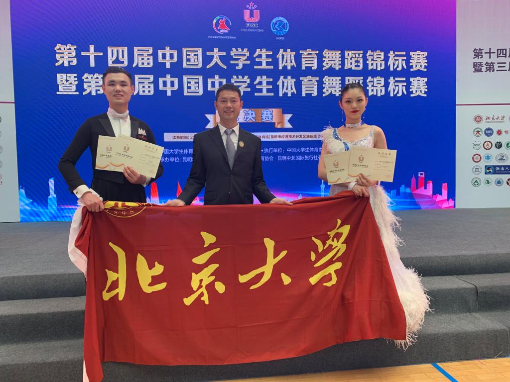 第十四届中国大学生体育舞蹈锦标赛暨第三届中国中学生体育舞蹈锦标赛于2018年10-11月分南区、北区两个赛区分别在成都师范学院和青岛大学举行,南、北区各组别进入半决赛的选手获得入围总决赛资格。北大由教练吴定锋带队,经过北区赛的激烈角逐,多名选手获得总决赛资格,由于时间等多方面原因,本次总决赛由陈钦钲、张慧君两位同学代表北大参加昆明总决赛,经过多轮比拼,最终获得业余组华尔兹单项第七名,并评为优秀选手。